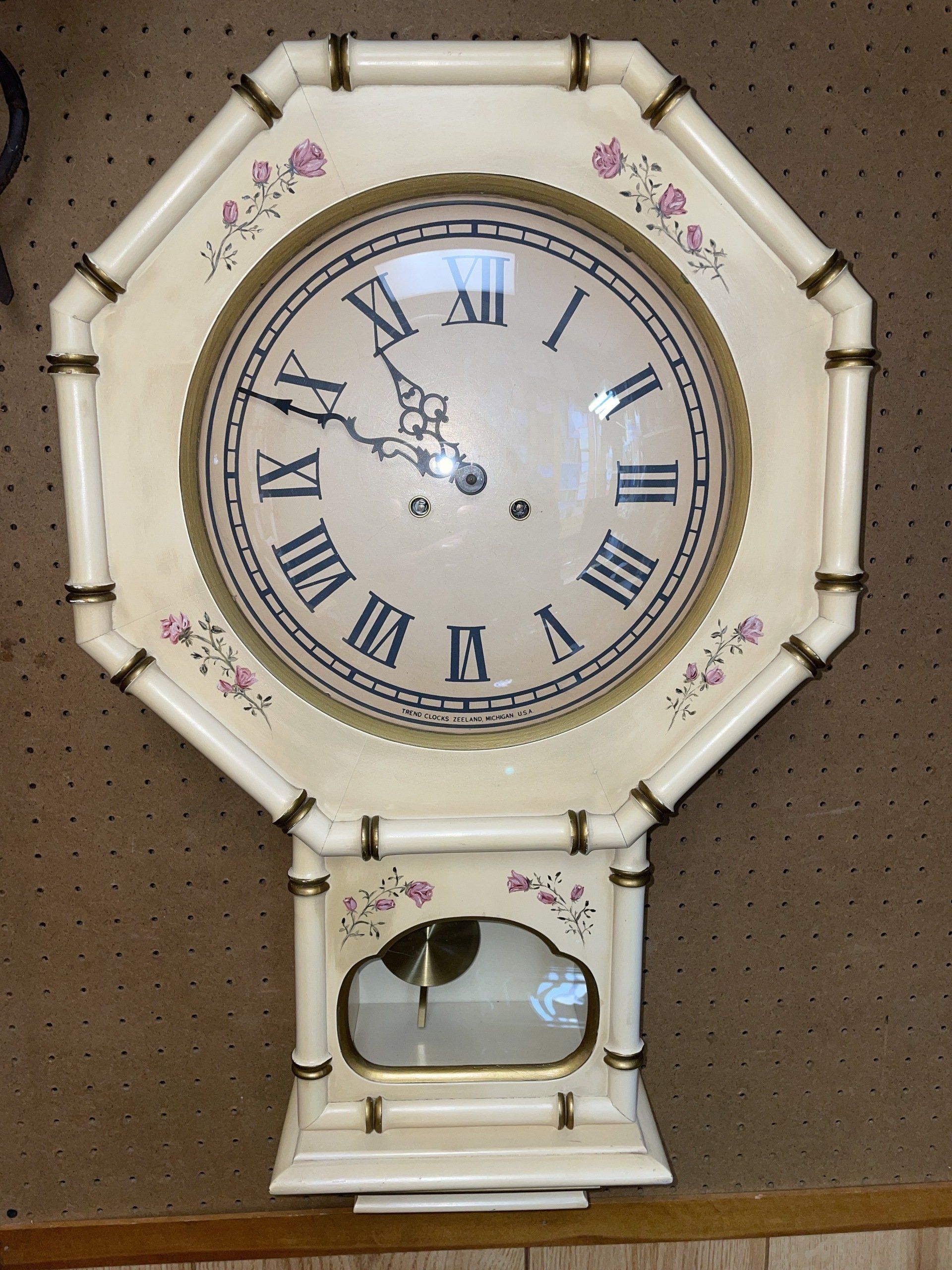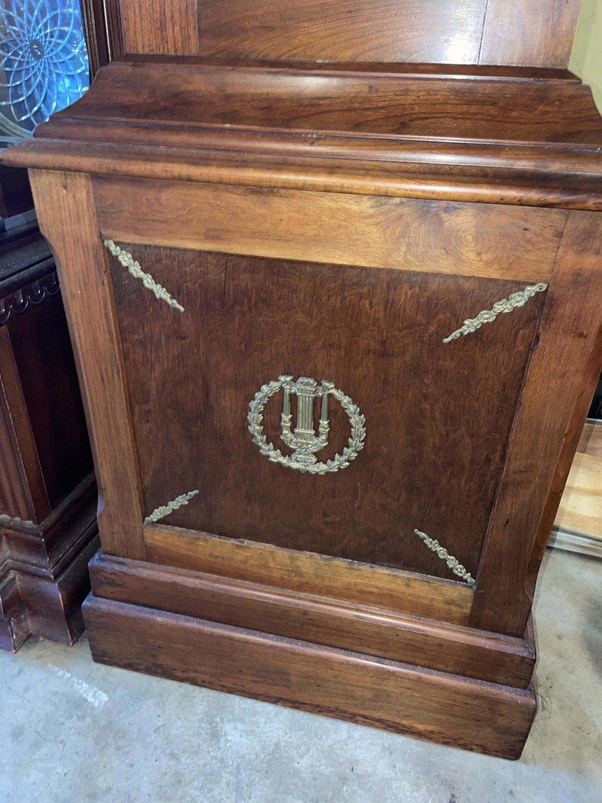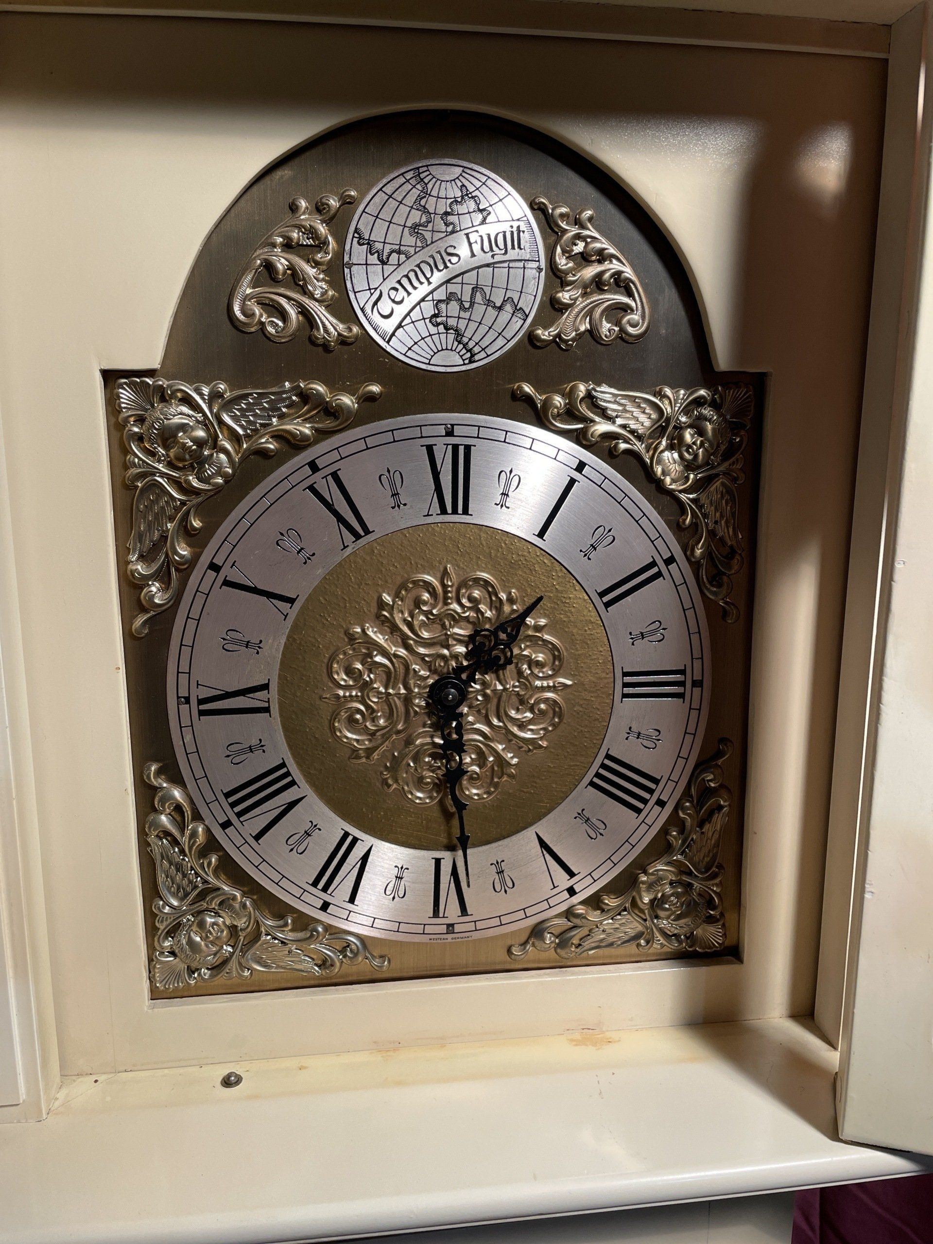 Also called a Bride’s clock. Beautiful case and in running condition. Recently cleaned and oiled. Westminster chime. The clock is 74 1/2 inches tall by 16 wide by 10 deep. This is a very unusual model to find. The Daneker company made great clocks in the 1950 to 1970 era.