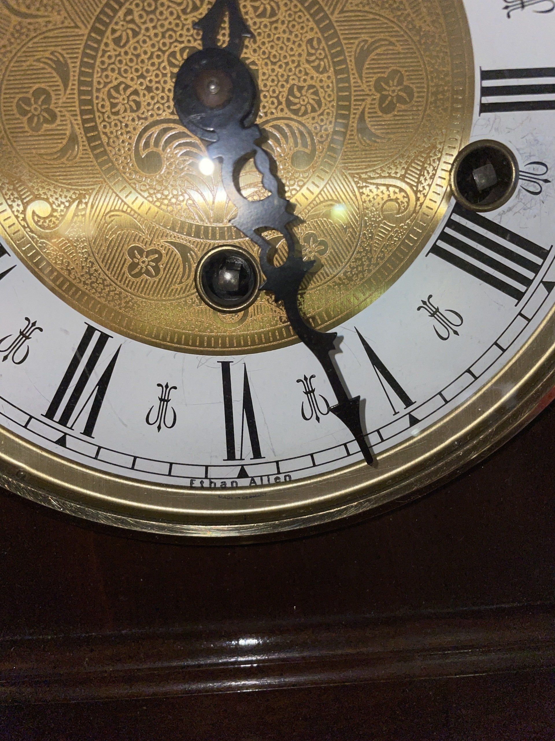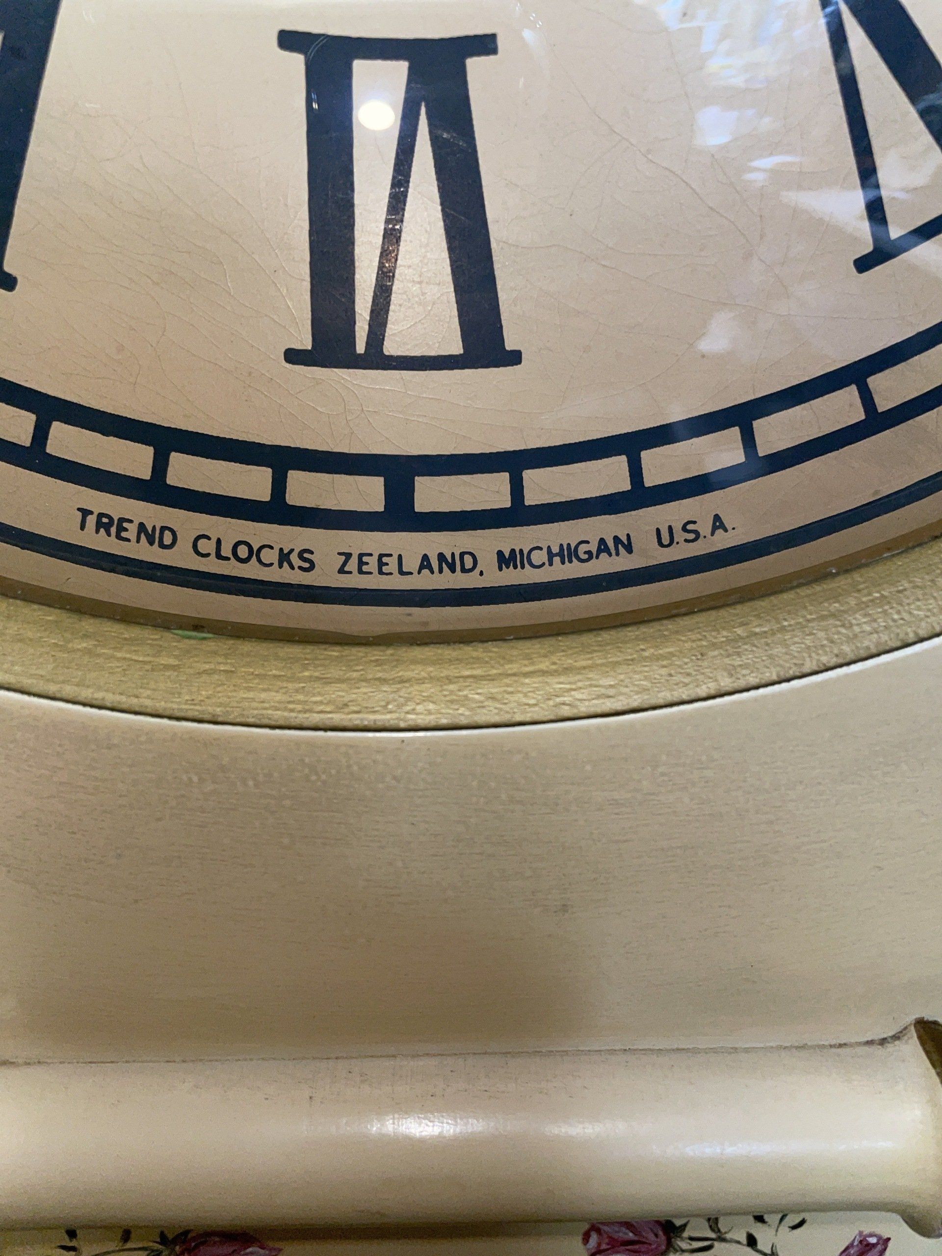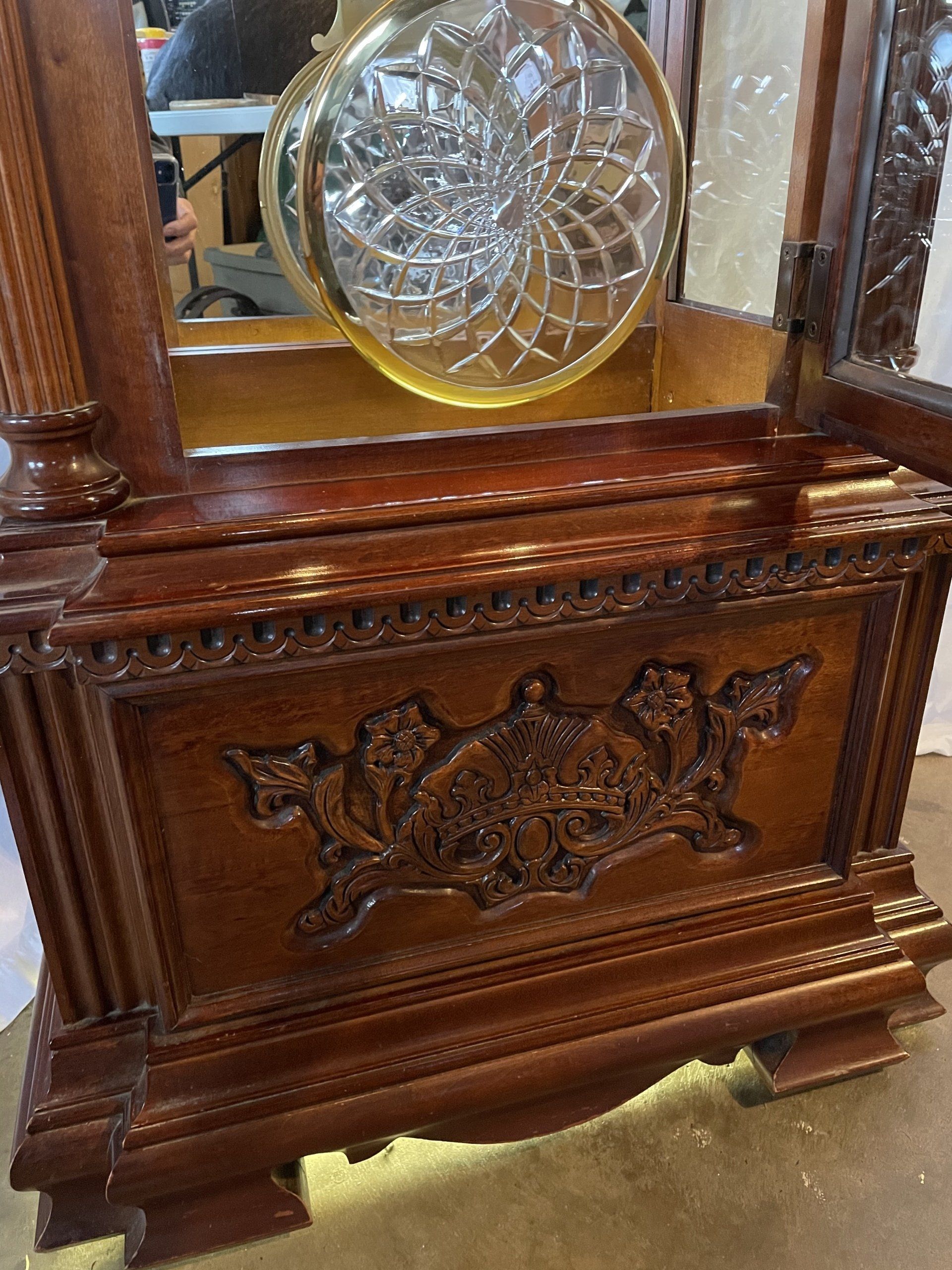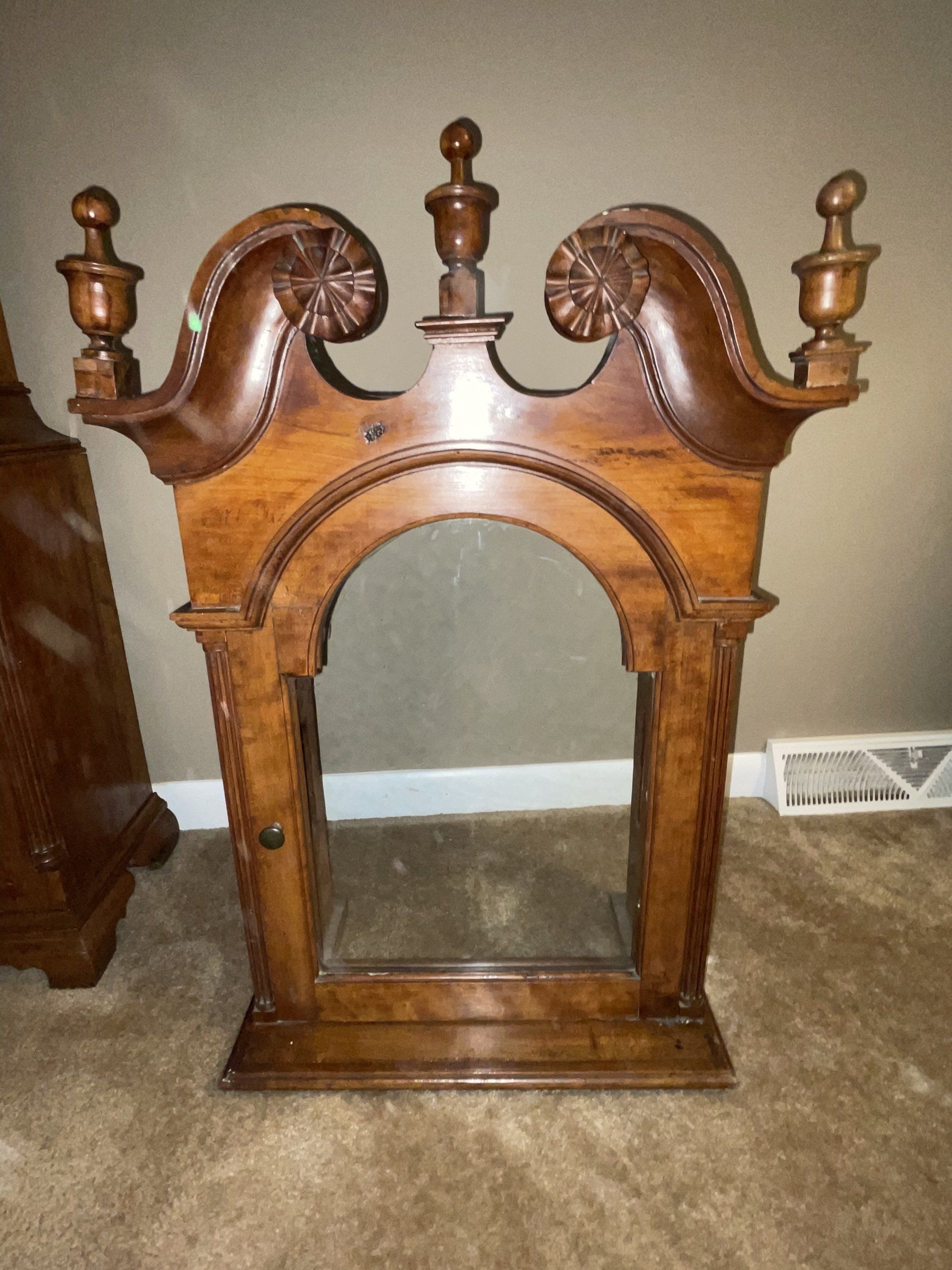 Also called a Bride’s clock. Beautiful case and in running condition. Recently cleaned and oiled. Westminster chime. The clock is 74 1/2 inches tall by 16 wide by 10 deep. This is a very unusual model to find. The Daneker company made great clocks in the 1950 to 1970 era.